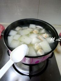 主料:冬瓜400g;鱿鱼条100g;扇贝皇100g;鱼丸100g;