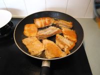 1、三文鱼骨先用盐与黑胡椒粉腌制让它入味。2、开始大火煎然后转小火。