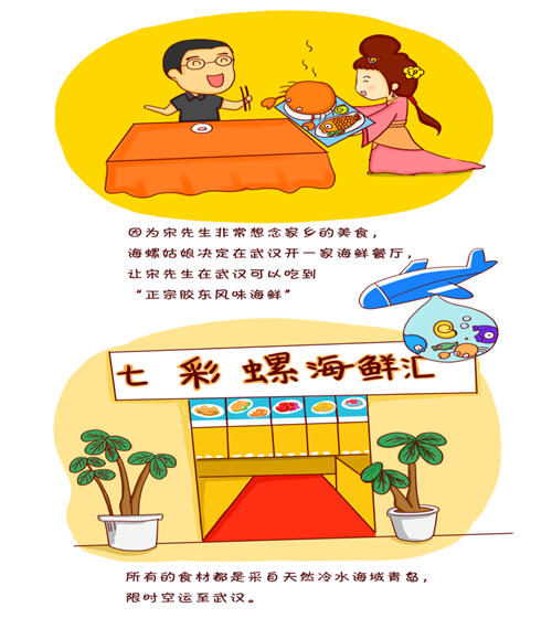 和许多出门在外的胶东人一样,宋先生经常会想念自己家乡的美食。为了宋先生,海螺姑娘决定在武汉开一家海鲜餐厅,这样宋先生还有那些喜爱海鲜的朋友,每天都可以吃到正宗的胶东风味海鲜菜。这家海鲜餐厅的名字就叫七彩螺海鲜汇。